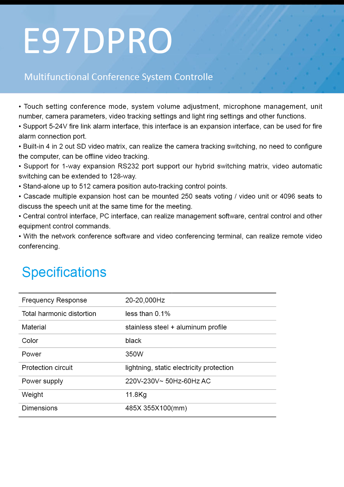 · The digital equalization circuit can significantly enhance the sound pressure level in the conference room, effectively preventing feedback.