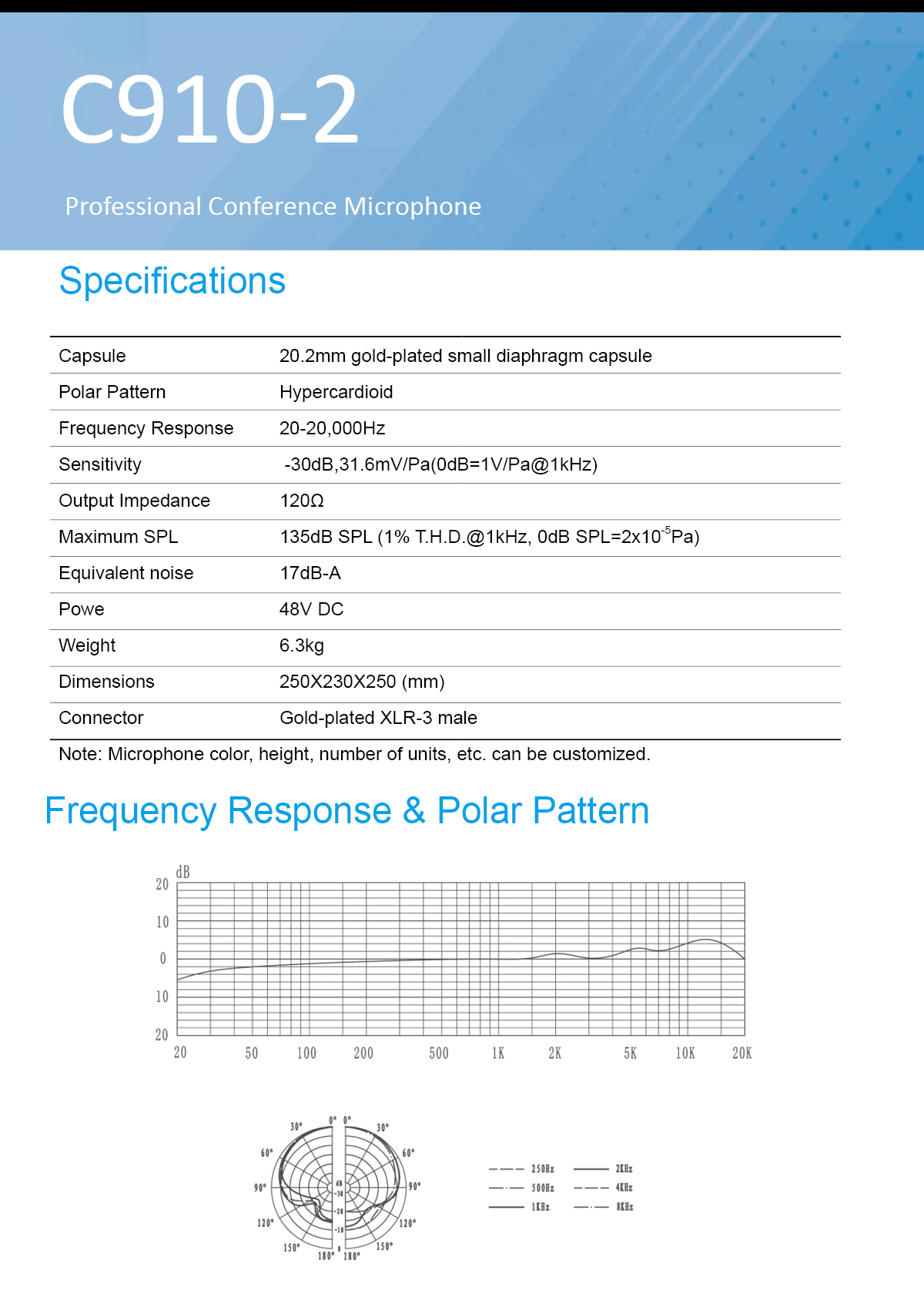 The C910-2 is a podium condenser conference microphone that can be directly connected to mixing consoles, amplifier stations and other audio equipment. It is equipped with a 20.2mm diameter high sensitivity gold-plated condenser capsule. Through precise calculation of column distance and acoustic interference, it adopts line array technology, thus suppressing ambient noise and improving sound pickup ability. The microphone is characterized by ultra-low noise, low distortion, wide frequency response, high fidelity, and translucent and mellow tone. The microphones do not affect each other and can work independently or in an array, providing multiple protection. One-piece metal shell with exquisite preparation of the mesh cover and the base of the solid combination, the appearance of elegant and generous, unique and elegant. Applicable to the chairman of the meeting, press releases, large-scale speeches and other conference occasions.