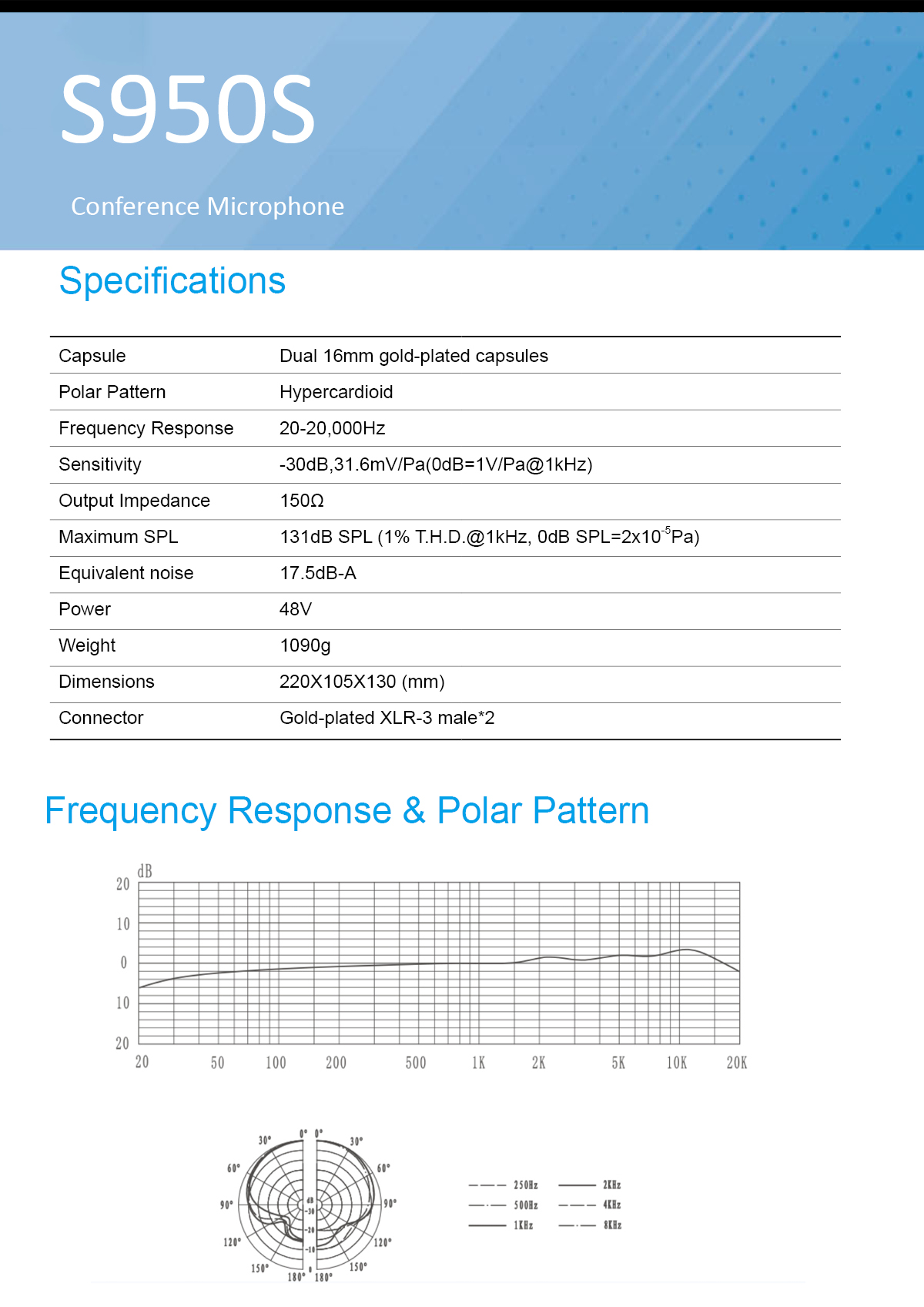 The S950S is a dual-channel condenser conference microphone that can be directly connected to audio equipment such as mixing consoles and power amplifiers. It is equipped with two high-sensitivity 16mm diameter gold-plated condenser capsules. The dual-channel, backup design provides independent output for each analog channel, without mutual interference, providing double reliability. The soft-touch mute button effectively avoids mechanical button noise. The indicator light ring is soft and bright, making it easy for users to observe the working status of the microphone; the switch at the bottom can change the working status of the indicator light. The integrated metal shell, paired with a delicate woven mesh, forms a unique sound cavity that can pick up sound clearly without distortion. The microphone's appearance is elegant and generous, sturdy and durable, making it suitable for a variety of conference venues.